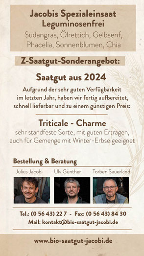 Die Entwicklung des Bioanbaus konnte Josef Jacobi bereits in der Pionierphase mit prägen und stellte seinen Betrieb bereits 1980 auf ökologische Landwirtschaft um. Seit 1964 wird auf unserem Betrieb Saatgut vermehrt und vermarktet. Durch über 50 Jahre Erfahrung ist Josef Jacobi ein kompetenter Berater, der sein umfangreiches Wissen an Sohn Julius weitergibt, um sie bei der Wahl des Saatguts fachmännisch beraten zu können.
